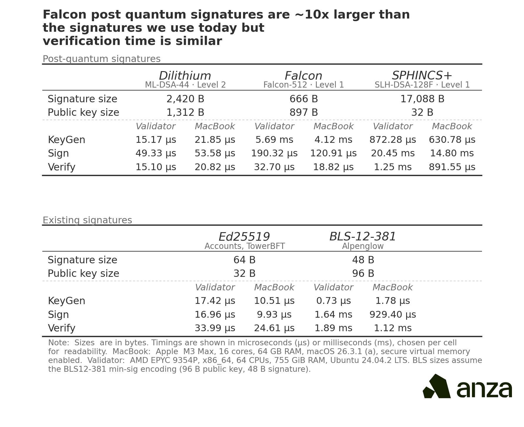 The main downside of post-quantum signatures is size. FALCON signatures, the smallest of the three NIST schemes, are roughly 10 times larger than Ed25519 signatures.