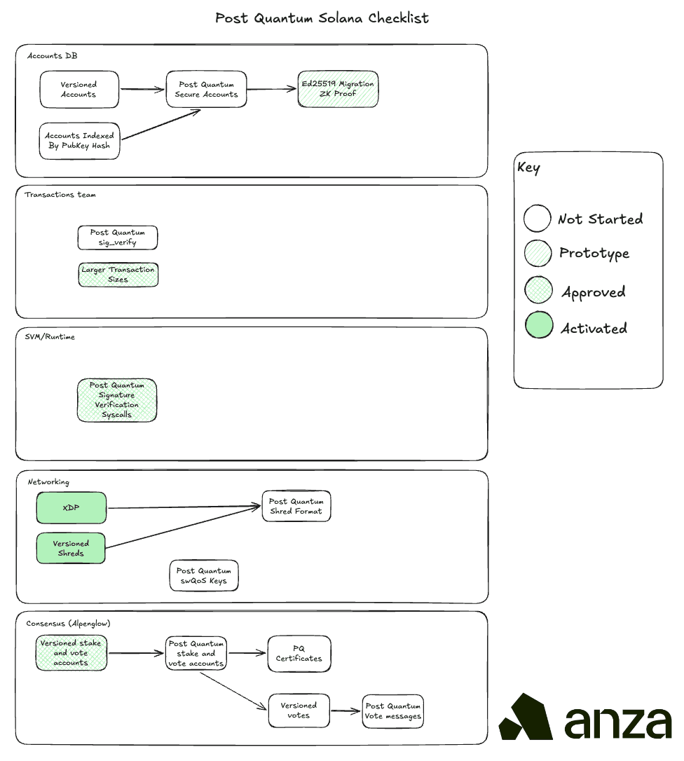 Cryptographically relevant quantum computers are likely still several years away, but Solana should not wait for Q-day to begin preparing. The Anza team and members of the Solana community have already started laying the groundwork for a post-quantum transition: identifying the parts of the protocol that depend on elliptic curve cryptography, evaluating post-quantum signature schemes, increasing transaction sizes to accommodate larger post-quantum signatures, and preparing migration paths so that we are prepared to protect users and applications well before the need arises.